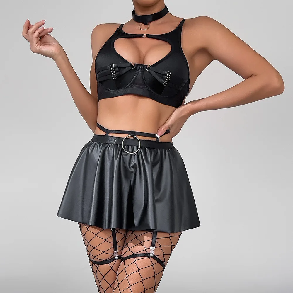 Dark Gothic Harness Lingerie Set Sexy Cut-Out Bra with Leather Mini Skirt